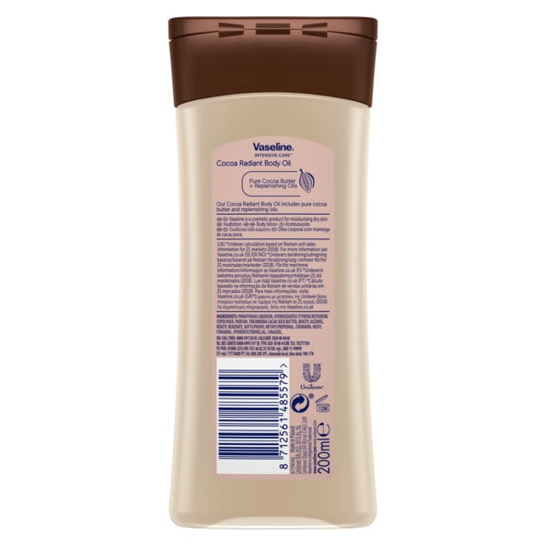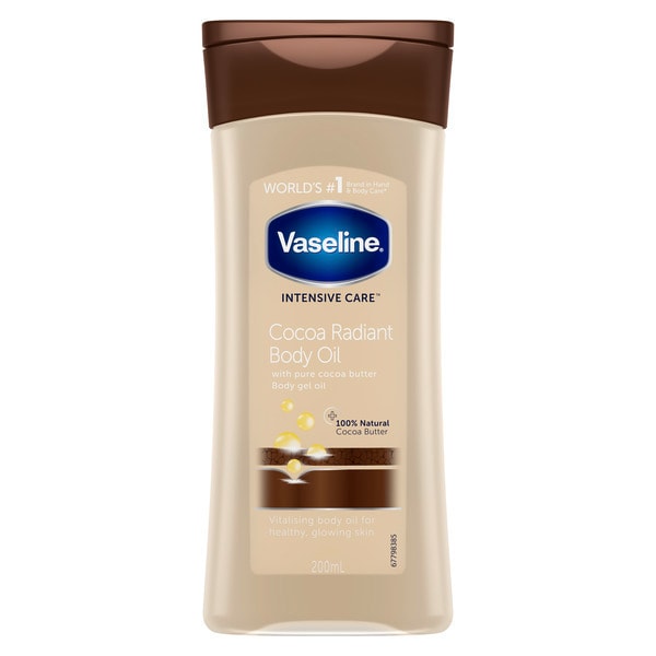 - Apply Vaseline Intensive Care Body Oil Cocoa Radiant onto damp skin after a shower or bath.